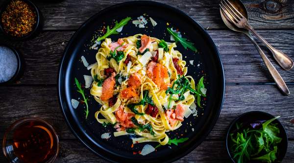 Pasta rellena de queso y pera con nata, tomate natural y gorgonzola