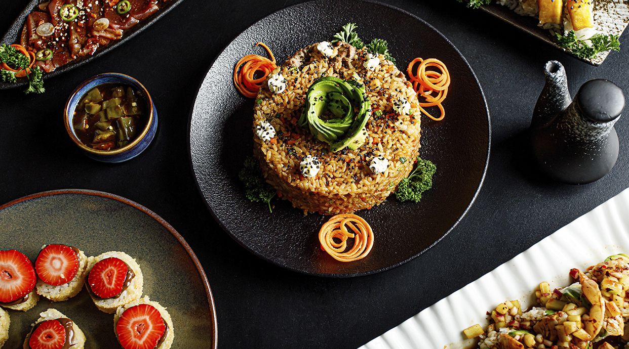 ARROZ SUSHI ,SALSA MEJOSKO, AYÚN, QUESO CREME,WAKAME, MANGO,UVA PASA, MAIZ DULCE,AGUACATE Y CRISPYONION