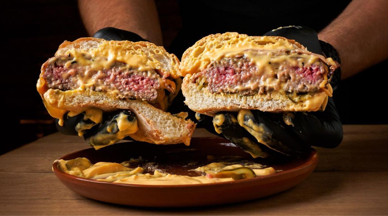 Doble carne smash con queso cheddar, nuestra salsa cheddar, pepino encurtido casero, bacon y pan sin gluten