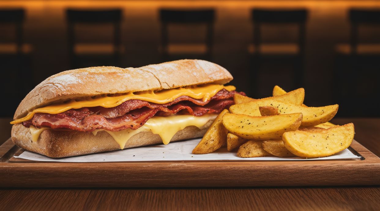 Pan crujiente, lomo, queso, jamón, pimiento asado y alioli