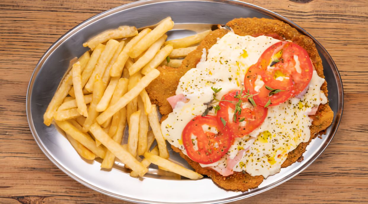 Producto típico de Argentina hecho con carne de ternera empanada acompañado con salsa de tomate, queso, jamón york y patatas fritas