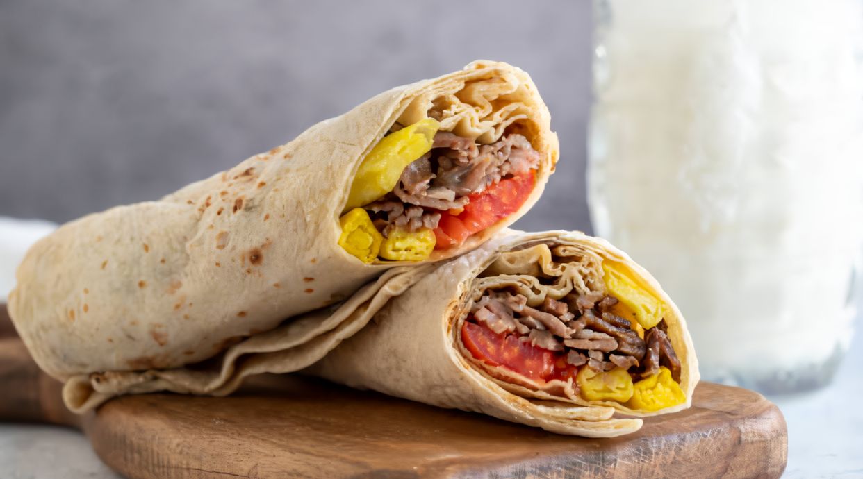 Rollo de pan fino enrollado con carne, tomate, lechuga, cebolla, zanahoria, maíz y salsa blanca