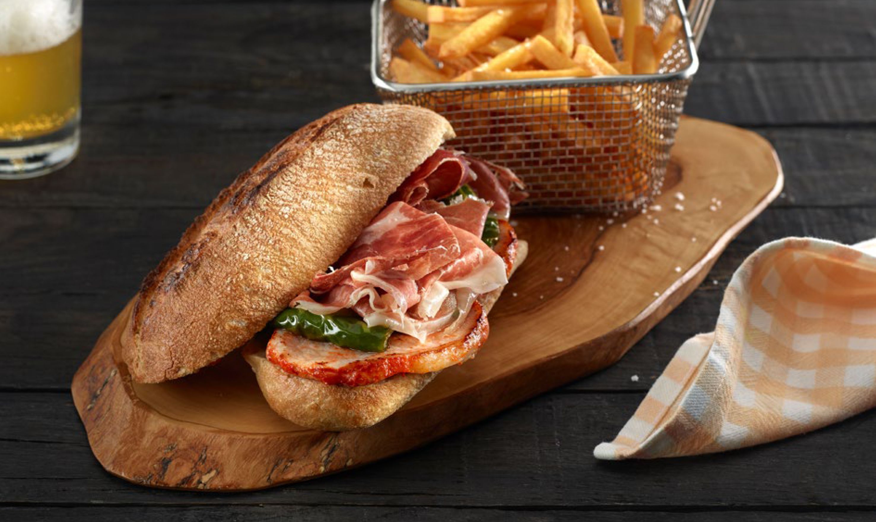 Baguette gallega con filete de cerdo, jamón serrano y pimiento frito