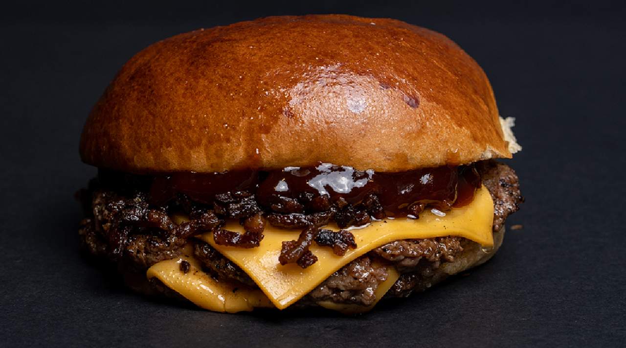 Brioche Potato Roll, doble disco de carne 100% angus, cheddar, bacon crujiente, salsa BBQ y salsa cheddar.