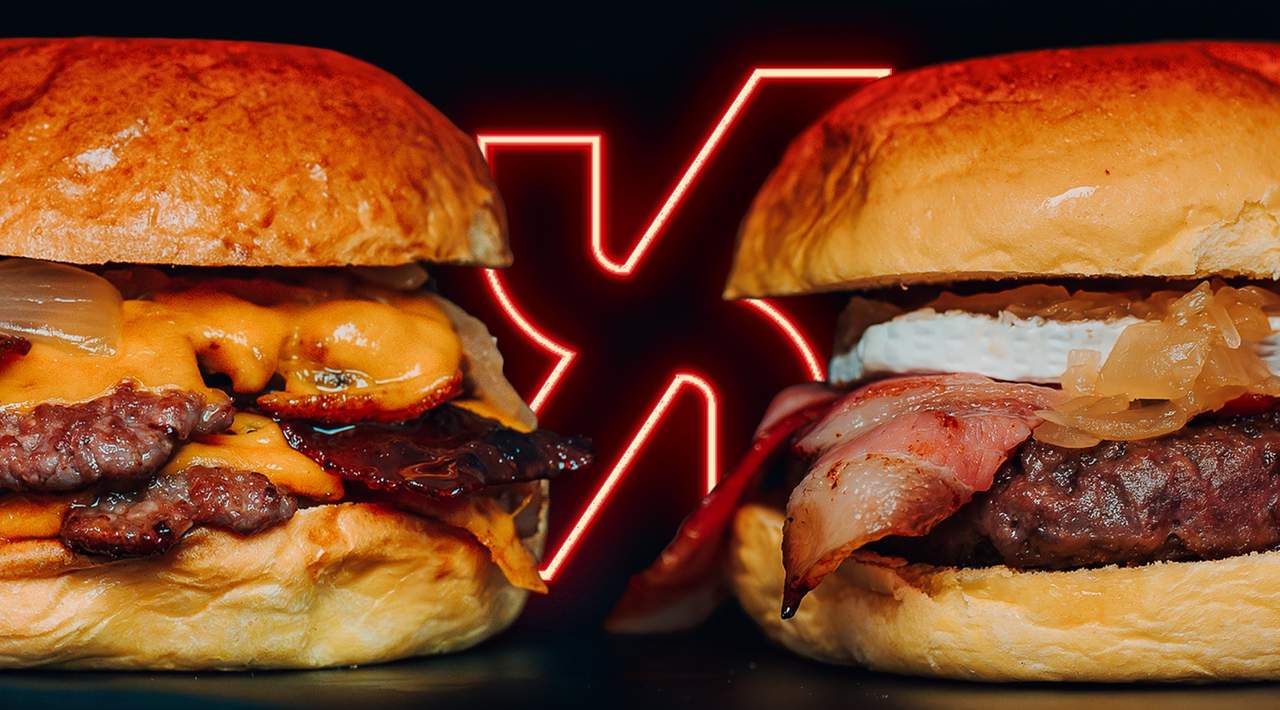 Carne 100% ternera, cheddar fundido, bacon crujiente y cebolla caramelizada