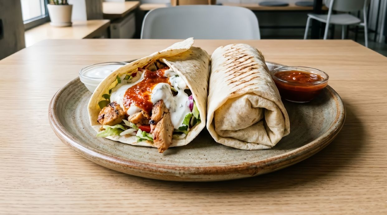 Rollo de pan de pita con pollo, lechuga, cebolla, tomate y salsa blanca.