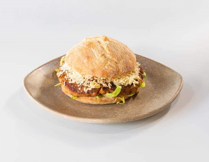 Pit de pollastre, enciam romà, ceba cruixent, cheddar i mahonesa