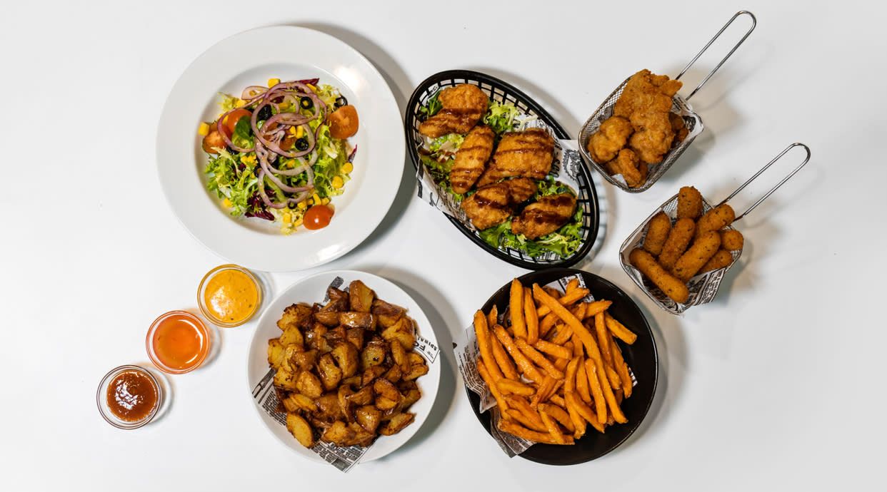 Trozos de pollo rebozados, cheedar, mezclum, cebolla morada, tomate y mayonesa de miel y mostaza