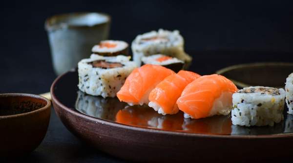 Aguacate, salmón, queso, huevas, arroz y alga nori