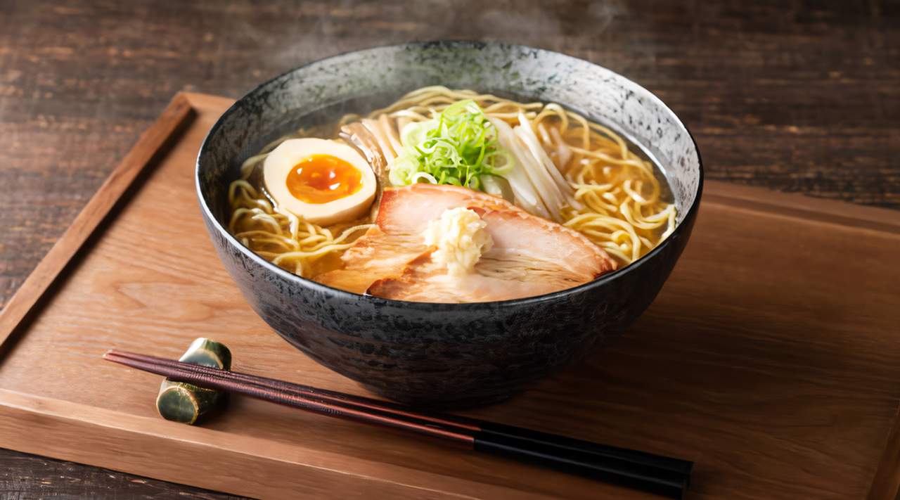 Caldo de ternera, fideos, huevo marinado, bambú, tiras de oreja de madera, hortalizas y char siu de ternera