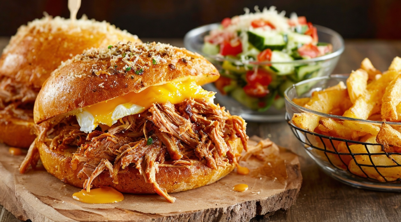 Pan brioche relleno de huevo revuelto, pulled pork BBQ, queso cheddar, cebolla crujiente y salsa sweet mayo