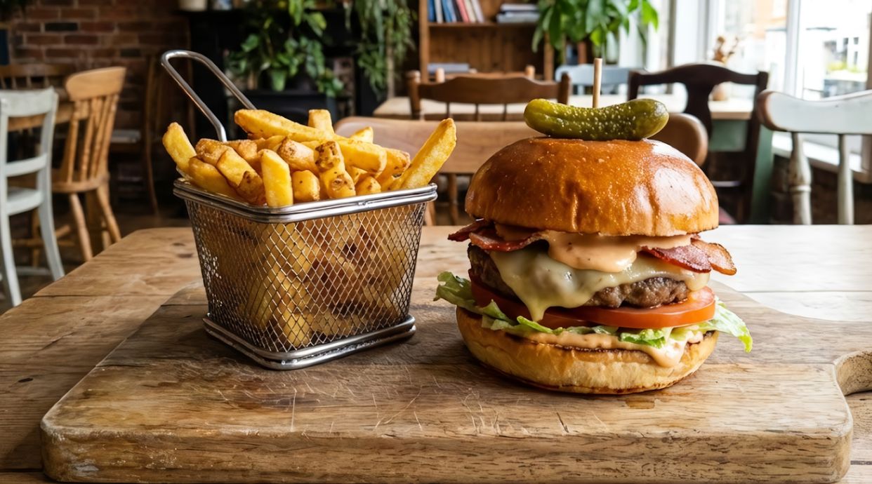 Doble de carne, pan brioche, queso brie, doble de queso cheddar, bacon ahumado, cebolla pochada, salsa trufada y patatas fritas