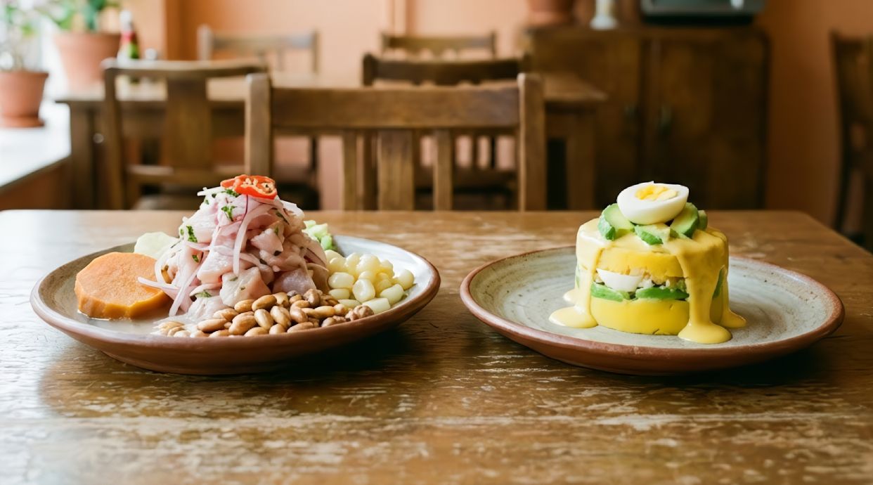 Dados de pescado marinado en limón y ajíes, acompañados de choclo y cancha