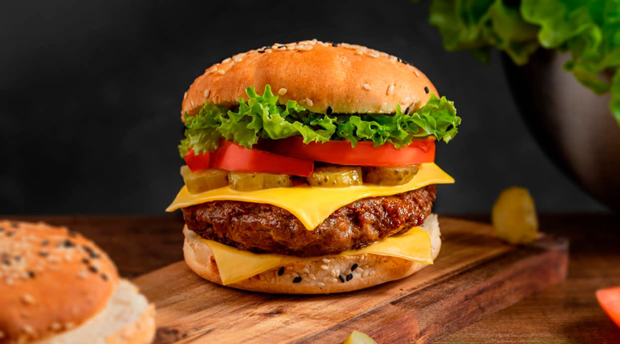 Hamburguesa de (110 g.), queso cheddar, pan brioche, patatas fritas hechas en casa, refresco, agua o zumo
