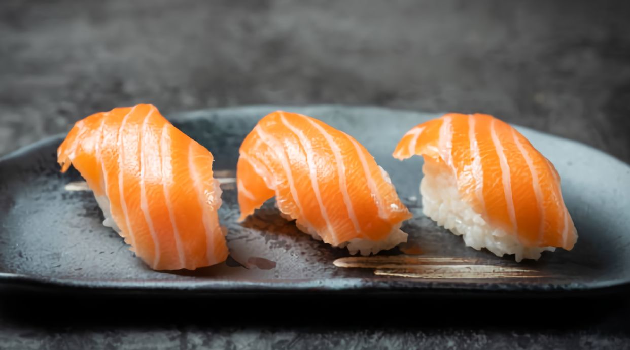 Salmón crudo sobre arroz de sushi. Puede contener alérgenos