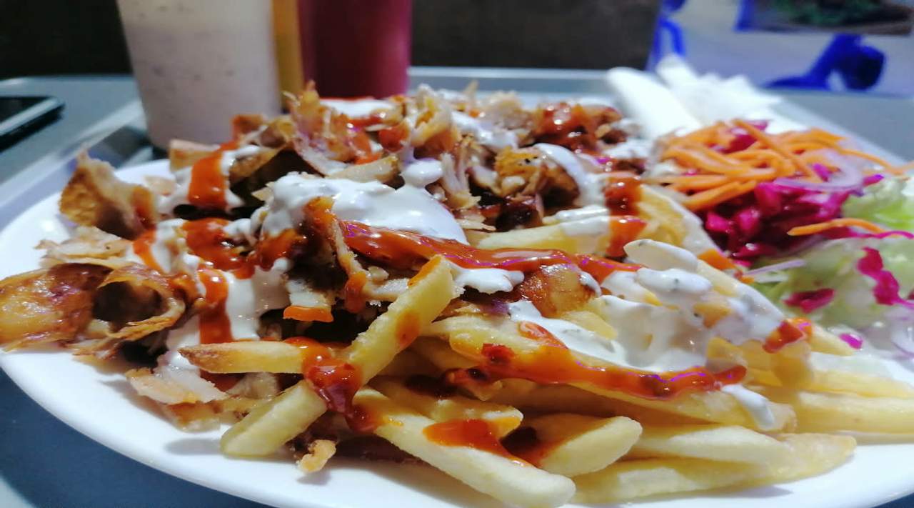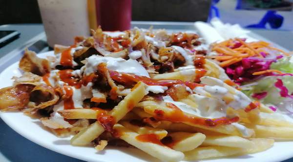 Carne de ternera y pollo, ensalada turca, falafel, queso de oveja y patatas fritas