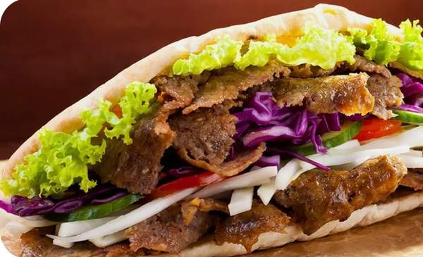 Rollo de fina masa de pan de pita con carne de ternera o pollo, lechuga, tomate, lombarda, cebolla y salsas