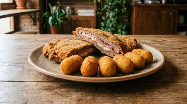 Doble filete de ternera relleno de jamón y queso, empanado