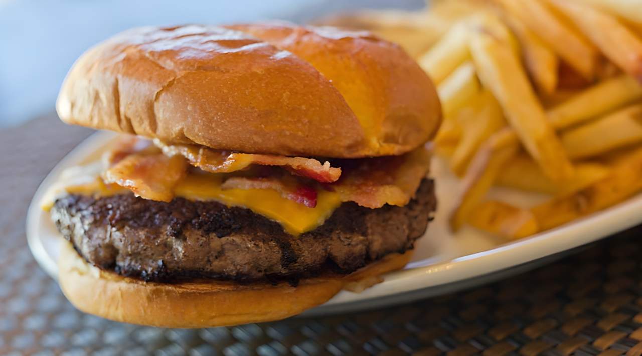 Pan hamburguesa clásico. Ternera angus (220 g.), cebolla pochada, queso cheddar, bacon, aros de cebolla fritos caseros y salsa barbacoa