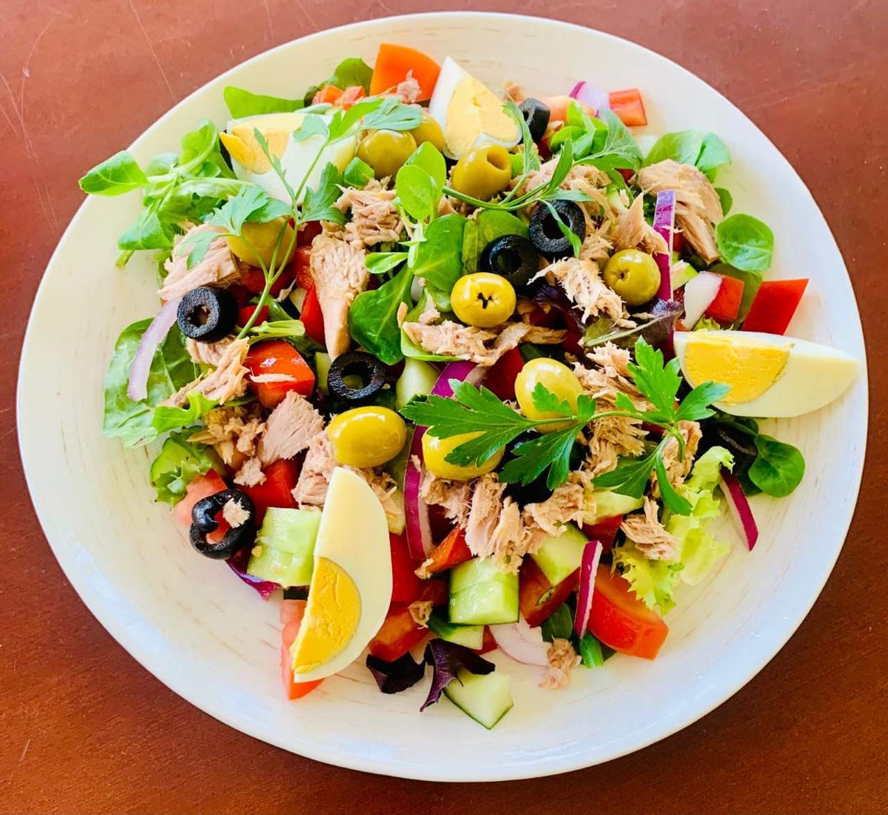 Lechuga, tomate, cebolla, pepino, alcaparras y huevo