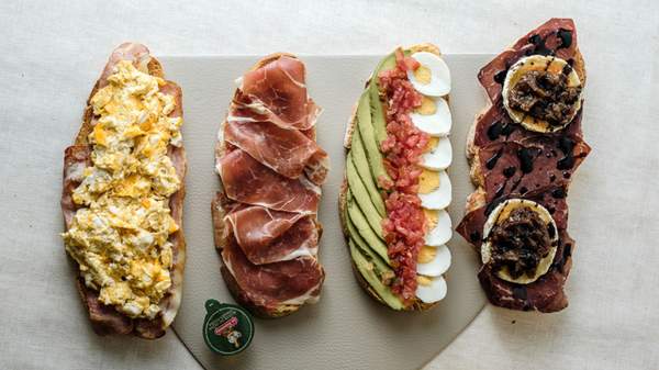 Pastrami, tortilla francesa, queso de cabra, lechuga, tomate y mayonesa