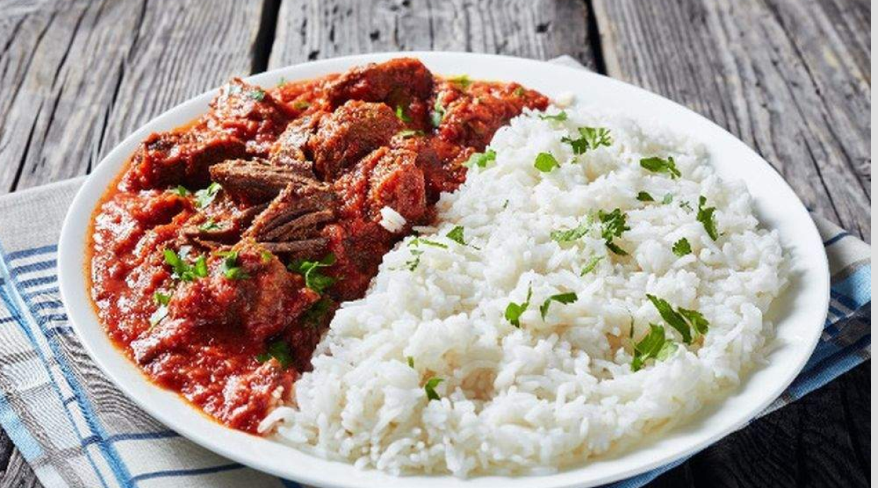 Carne de ternera estofada con arroz, maduro y aguacate