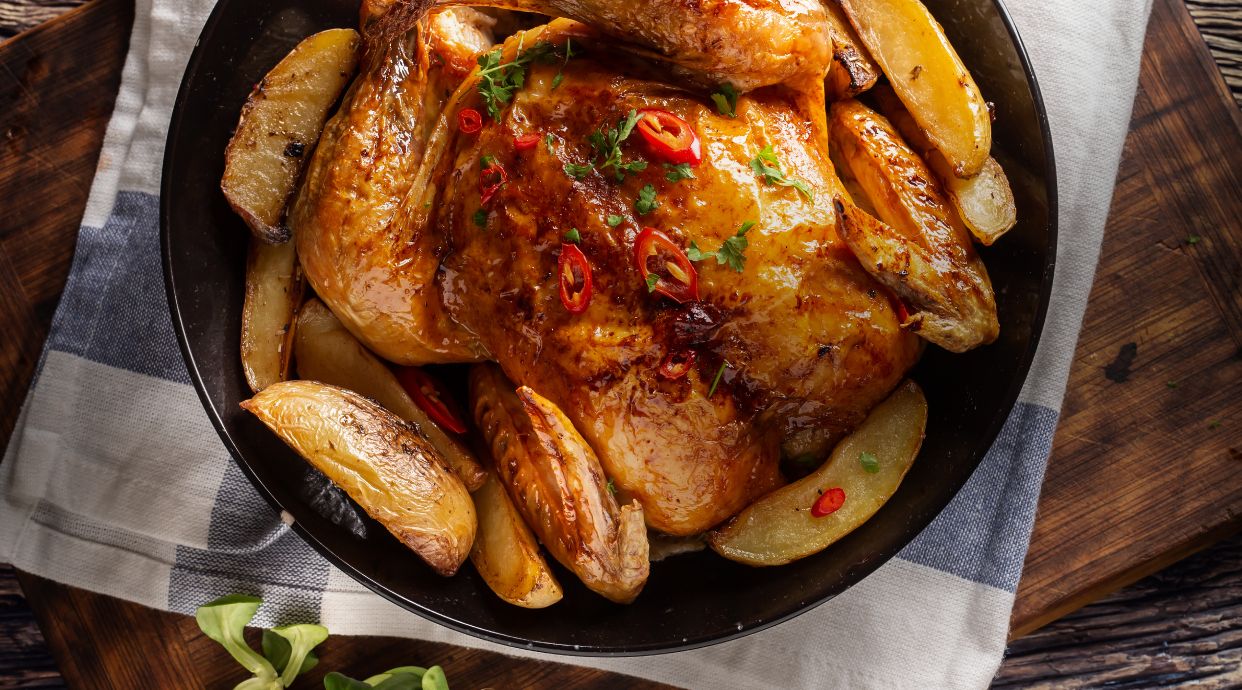 Delicioso pollo a la brasa en horno de carbón.