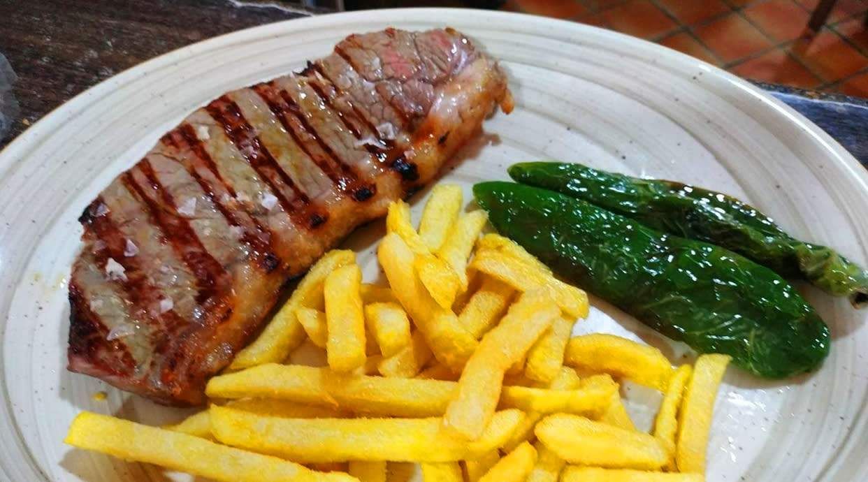 Lomo con ajos acompañado de patatas