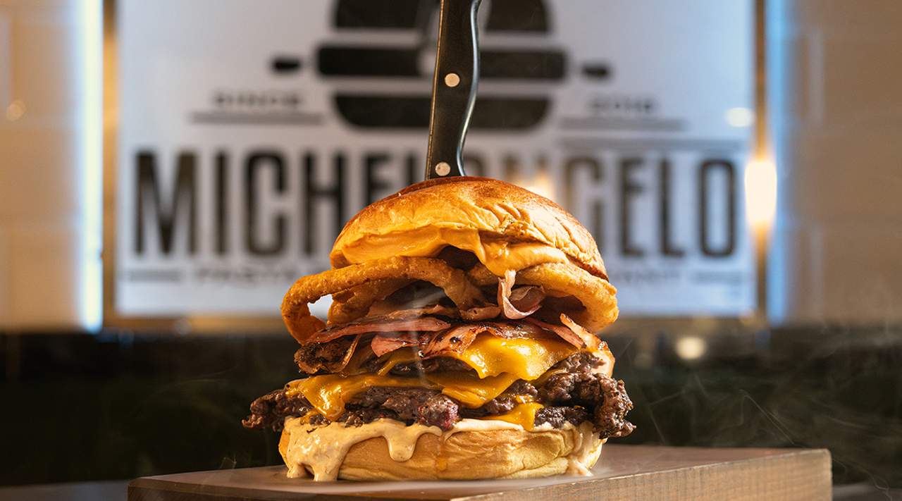 Triple Hamburguesa Smash mixta (Cerdo y Ternera), Salsa Cheddar, Aros de Cebolla, Crujiente Bacon Ahumado, Lonchas de Cheddar y la famosa Salsa Michelangelo.