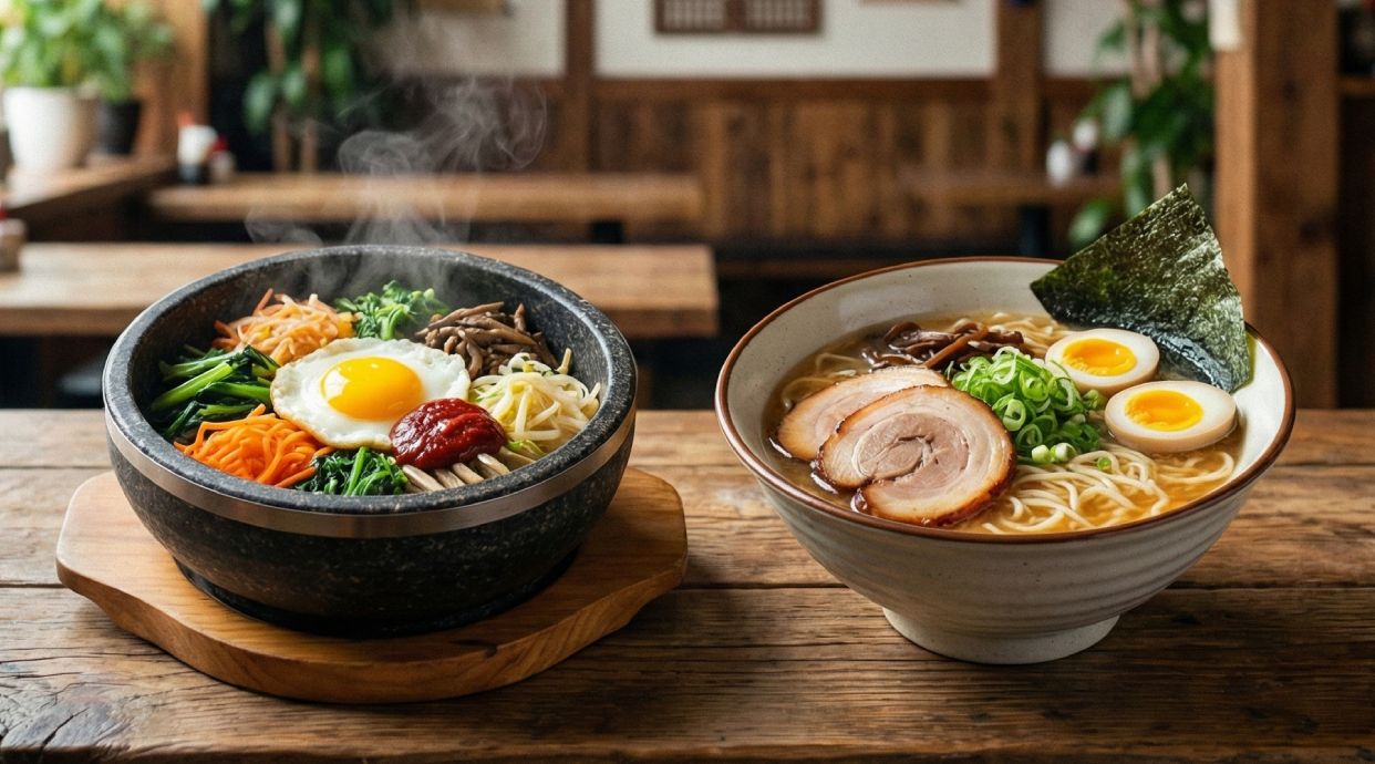 Ramen coreano picante con germinado de soja, setas shitake, calabacín, zanahoria, ternera, huevo frito y algas secas.