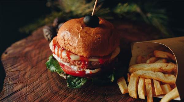 Hamburguesa de Angus irlandesa, bacon, queso brie, rúcula y mayonesa de trufa. Acompañado de patatas