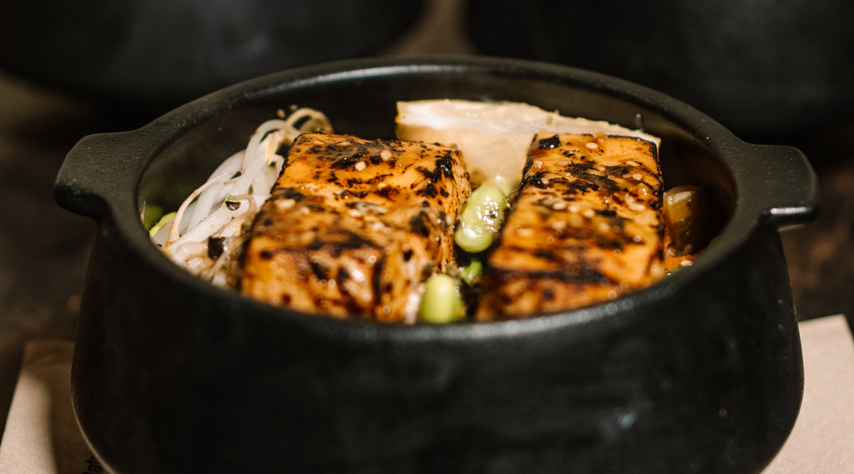 Arroz sushi, tofu o heura, mango, aguacate, edamame, cebolla roja encurtida, cacahuete y salsa wafu.
