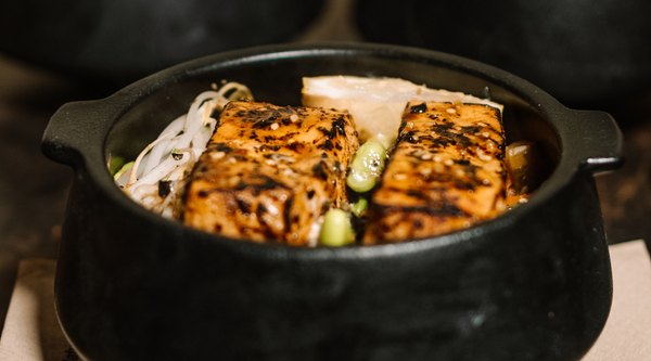 Arroz sushi, pollo, mango, aguacate, edamame, maíz, zanahoria, cebolla crujiente y salsa teriyaki.