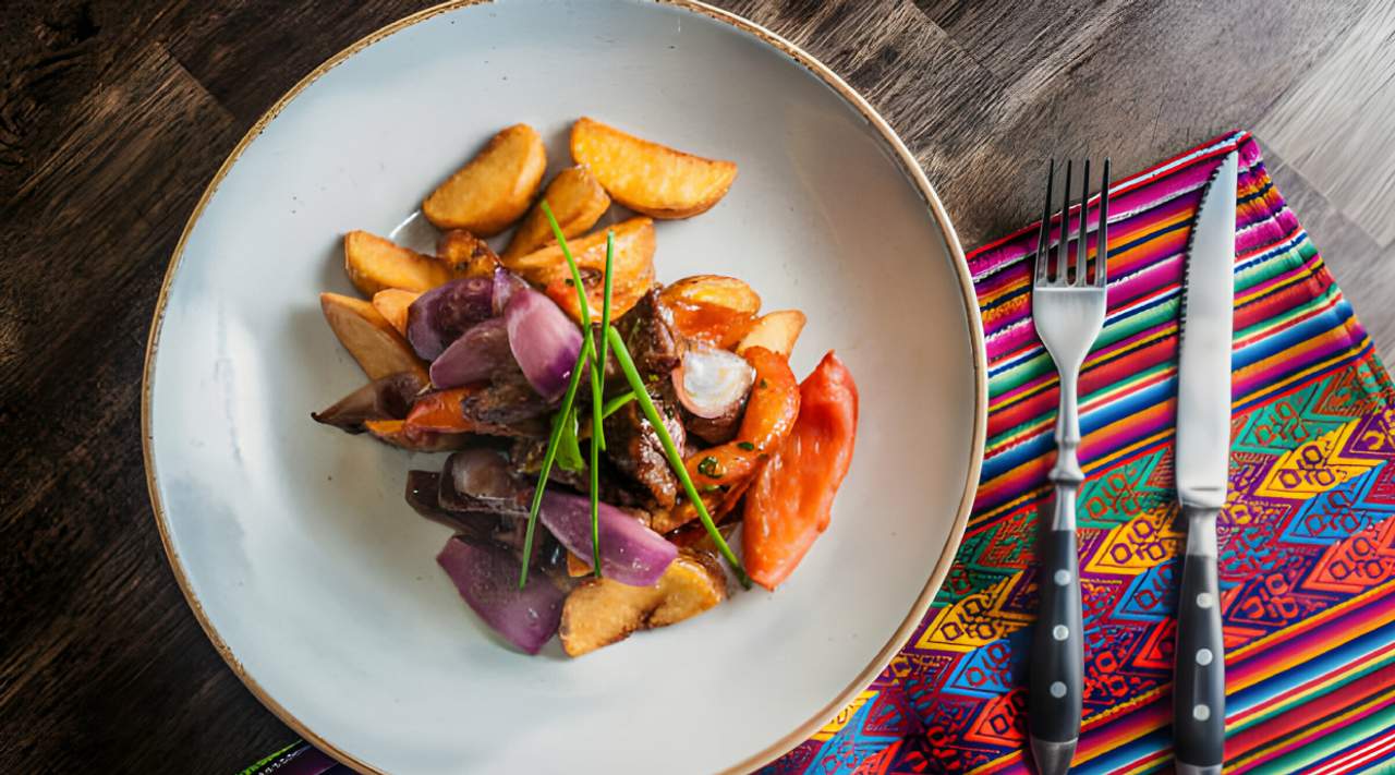 Se prepara con carne de ternera cebolla morada, ají amarillo, vinagre tinto o blanco, tomate, perejil, salsa oriental y especias pasando por un flambeado en wok dando un sabor ahumado acompañado de arroz blanco y papas fritas