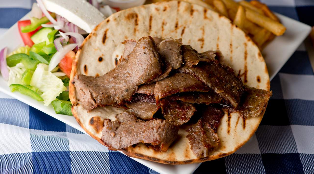 Queso halloumi a la parrilla acompañado de ensalada, tzatziki y pan pita