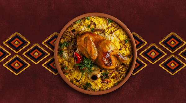 Jugoso arroz amarillo cocido con tiernos trozos de pollo y guisantes.