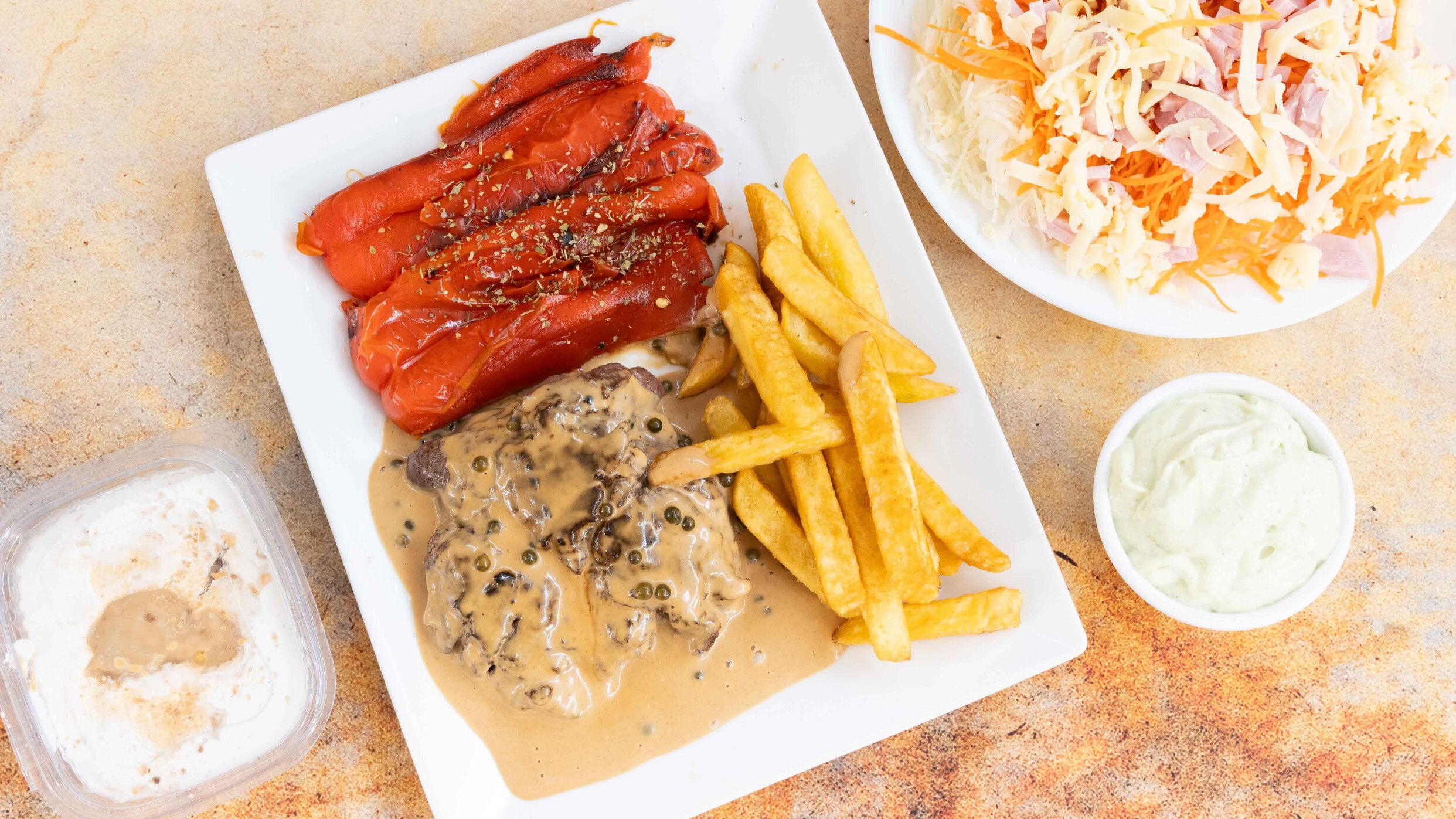 Calamar a la plancha sahariano con papas fritas y ensalada