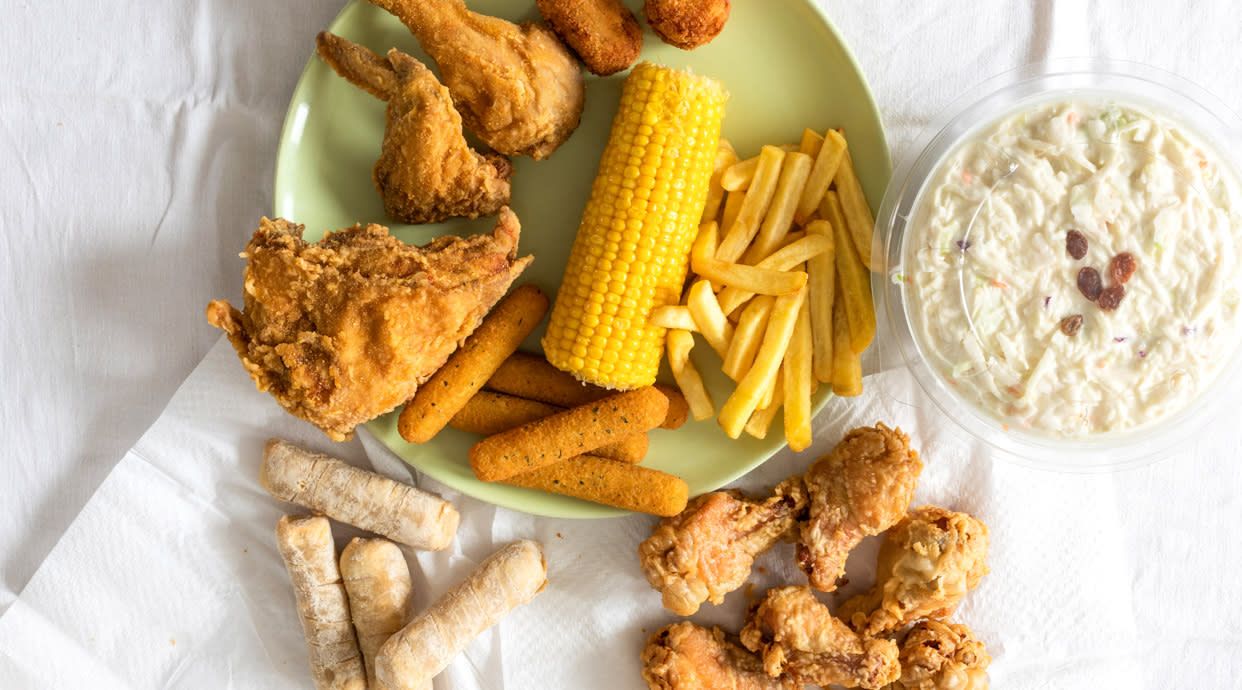 1 1/2 pollo frito, 3 de papas fritas, 2 piñas, 1 col grande, 1 salsa, 1 refresco 1.5 lt