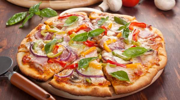 Base de pizza, salsa de tomate, queso mozzarella, jamón york, champiñones y orégano