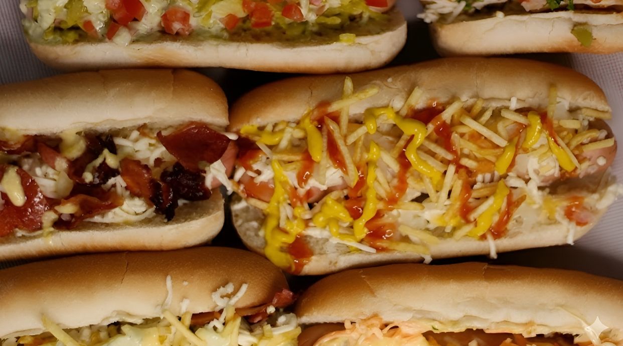 Pan, salchicha, mezcla de zanahoria, mayonesa y col, papa paja, salsa de maíz y cilantro
