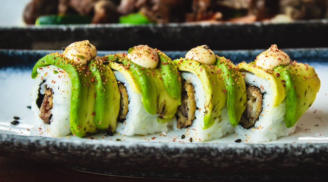 Maki con langostino empanado y aguacate, cubierto de laminas de vaca vieja gallega, mahonesa de chipotle y bonito deshidratado