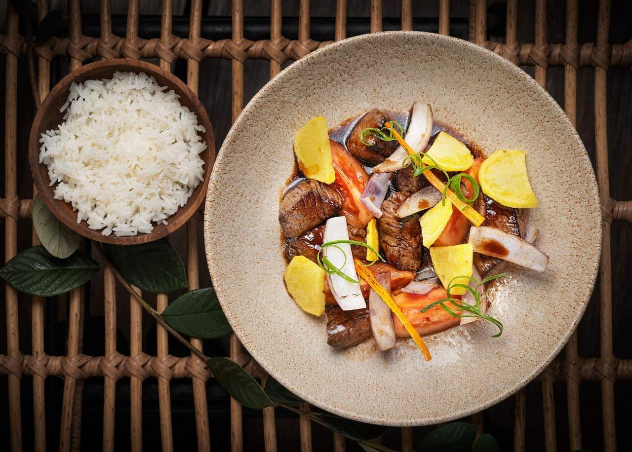 Solomillo de ternera, cebolla y tomate salteada en wok con salsa de soja, acompañado de arroz blanco y patata fritas.