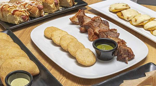 2 tequeños, 2 tostones, 2 cachapitas, 2 arepitas de reina pepiada y 2 empanadas de carne mechada.