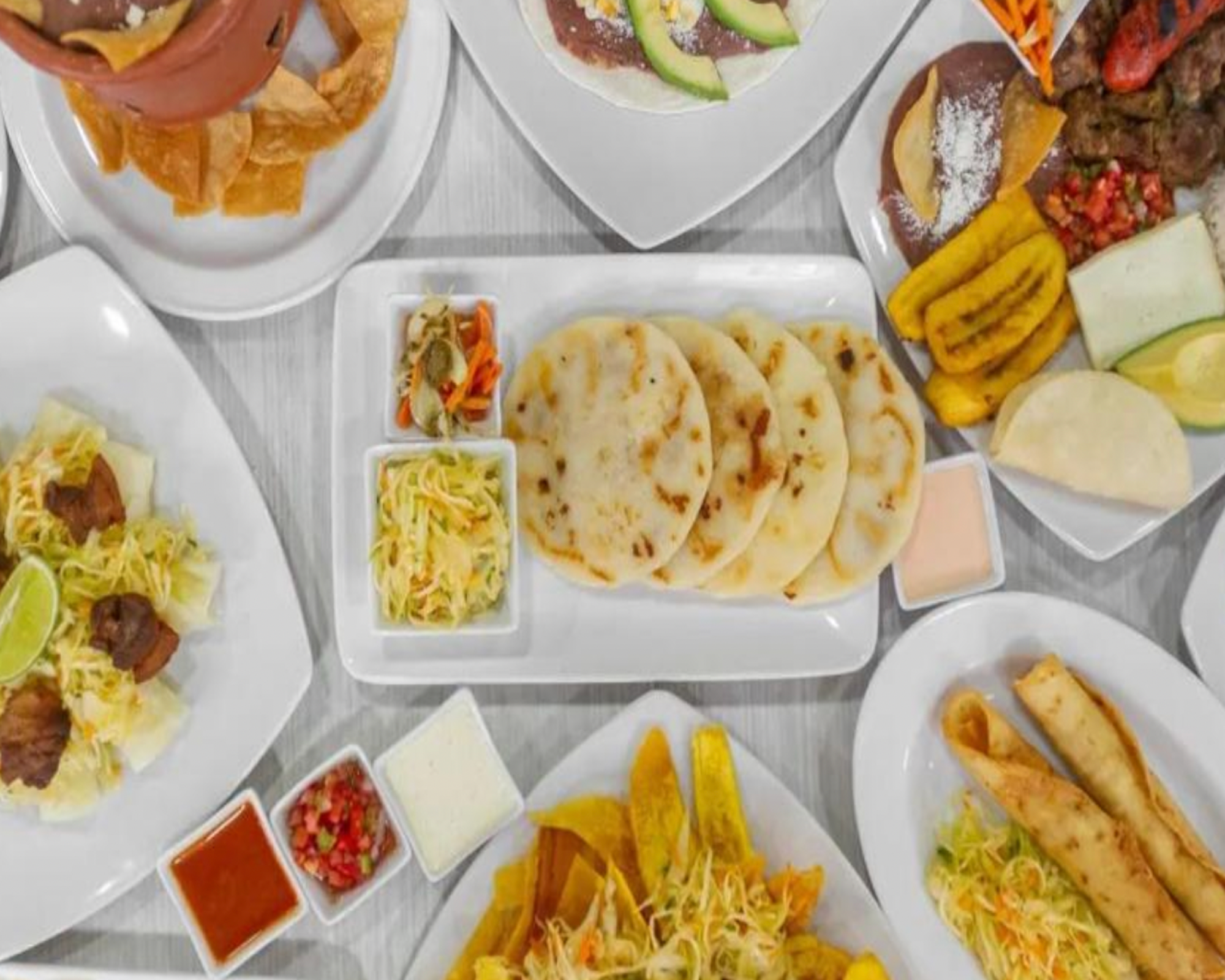 Porciones variadas de carnes, frijoles, arroz, queso, aguacate, chismol y las respectivas tortillas