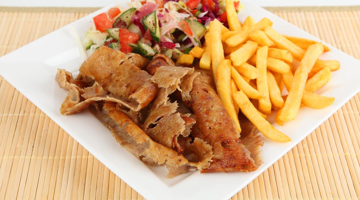 Kebab en pan de pita con doble ración de carne (pollo, ternera o mixto), doble porción de salsa y patatas fritas