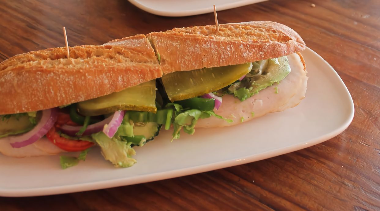 Una deliciosa combinación de pavo, queso brie y aguacate. Incluyen lechuga, tomate, pepino, cebolla, pimientos verdes, aceitunas negras, pepinillos y jalapeños