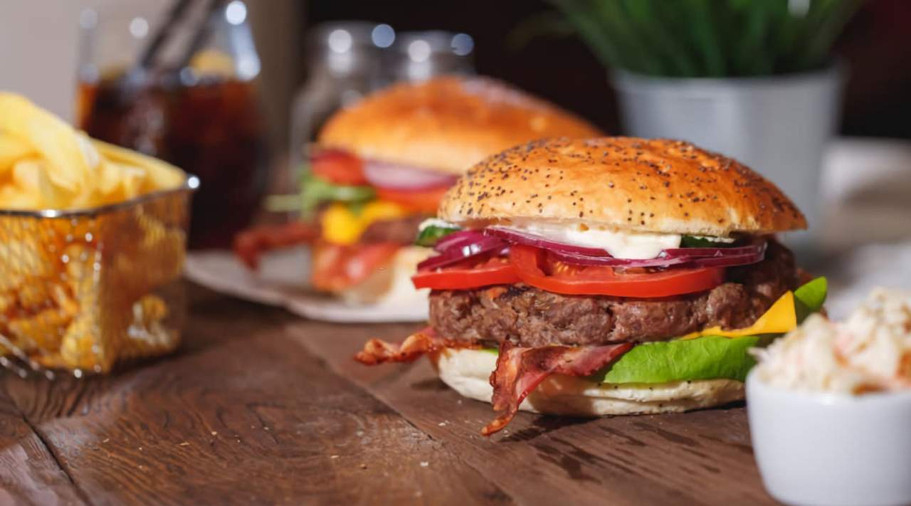 Hamburguesa de Angus, salsa de cheddar, bacon crujiente, pepinillo y cebolla caramelizada, acompañada de patatas gajo deluxe