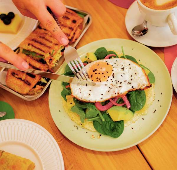 Tortilla de queso a base de almidón de yuca, con una textura suave por dentro y crujiente por fuera, huevo a la plancha por encima, aguacate, cebolla encurtida y espinaca fresca