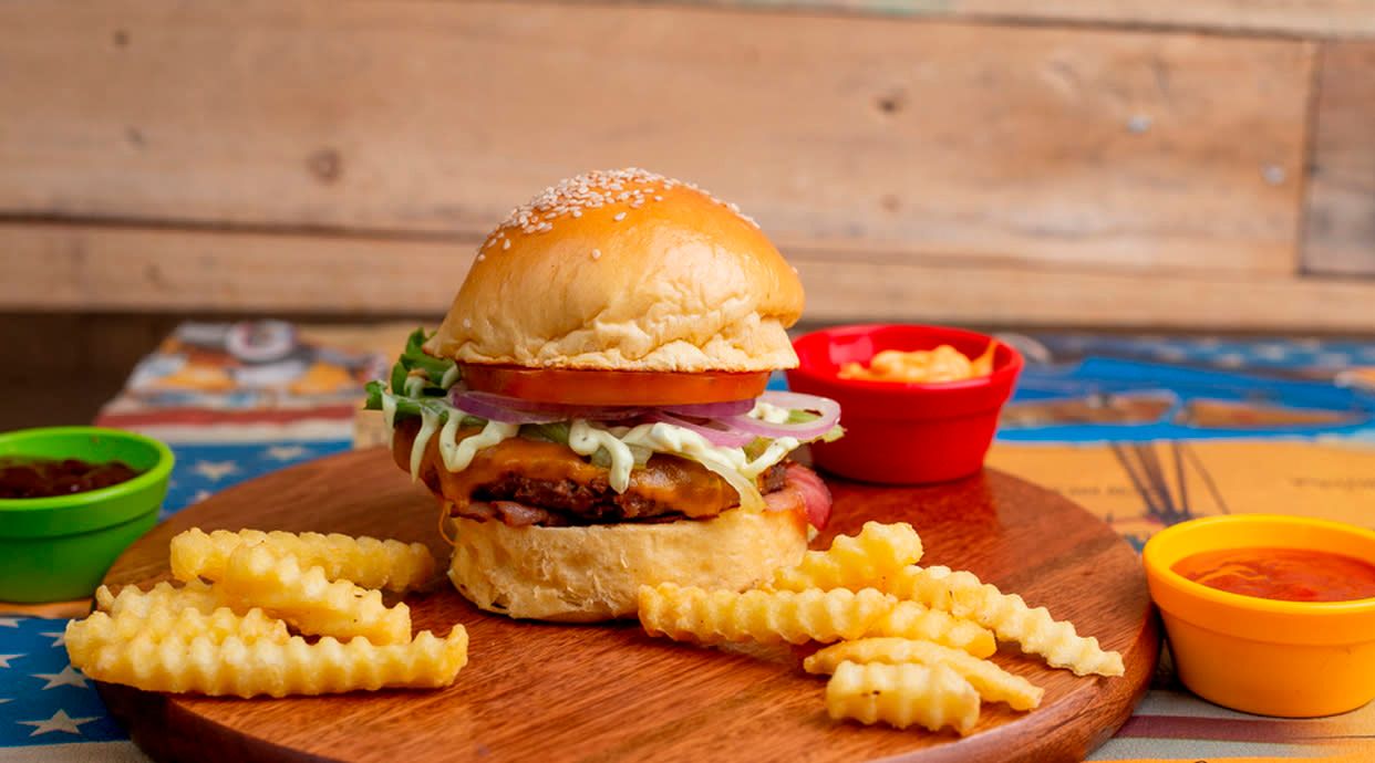 Doble burger (80 g.), bacón ahumado en casa, queso americano, lechuga, tomate, cebolla plancha, kétchup hecho en casa, mostaza y mayonesa