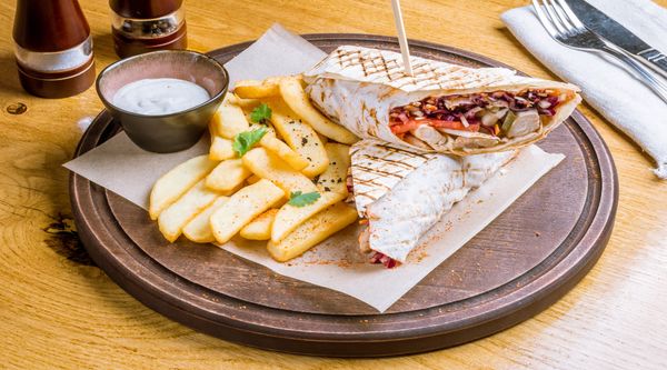 kebab con proteína a elegir (pollo, ternera, mixto o falafel), patatas, ensalada y salsa